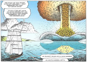 Jetzt will Dagobert den Dampfer des Sultans von Solo einholen, um seine Longhorns zurückzubekommen. Käpt’n Moore ist begeistert, denn er hat schon immer davon geträumt, mit einem Segler einen Dampfer, der Tod der Segler, zu überholen. Also geht’s los, der Wind steht gut. Sie nähern sich dem Dampfer, als seltsames Donnern ertönt. Und plötzlich kommt erneut ein Brecher. Was geht hier vor? Und da sehen sie in der Ferne plötzlich eine gewaltige Explosion: Ein Vulkan ist ausgebrochen und hat die ganze Insel Krakatau in die Luft gejagt. Es ist ein beeindruckendes Schauspiel, doch warum hört man nichts? Tatsächlich ist Krakatau 37 Kilometer entfernt, also kommen Schallwellen und co. erst in etwa zwei Minuten! Um die Schallwellen zu überleben, muss sich die Besatzung Wolle in die Ohren stopfen. Das schaffen sie auch noch gerade so rechtzeitig. Doch da kommt schon die nächste Gefahr: Eine gewaltige Aschewolke. Um die zu überleben, müssen sie sich auf den Boden legen und sich mit angefeuchteten Segeln bedecken. Auch das schaffen sie gerade noch so. Die Besatzung des Dampfers vom Sultan von Solo steht da weniger gut da. Doch es ist noch lange nicht vorbei! Denn jetzt kommt eine Tsunami-Welle! Dem Dampfer kann die nichts anhaben, weil der hinter einer kleinen Insel in Sicherheit ist. Doch die Cutty Sark ist in großer Gefahr! Doch sie schafft es noch, Fahrt aufzunehmen und auf der Welle zu reiten.[1] Auf dieser Welle rast das Schiff dann geradewegs auf die kleine Insel zu und fliegt drüber! Und dann überfliegt der Segler auch noch den Dampfer! Davon hatte Käpt’n Moore schon immer geträumt, doch aufgrund eines kleinen Kameraproblems kann er kein Foto machen.