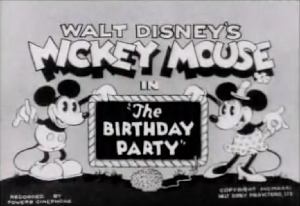 Der klassische Anfang der Micky-Maus-Cartoons, bei dem Micky und Minnie den Titel präsentieren (hier The Birthday Party)