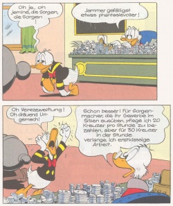„Woher soll ich das wissen? Ich brauche mindestens zehn Jahre, um es zu zählen!“– Donald Duck und Dagobert Duck - „Ich habe die Kanone schon geladen gekauft, gleich nach dem Krieg!“