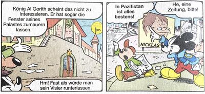 Doch hier begegnet Micky einem alten Bekannten: Gamma! Der Gute arbeitet zeitweise in der geheimen Organisation, die sich mit allerlei übernatürlichen Phänomenen befasst. Er klärt Micky auf, was es mit den seltsamen Robotern wahrscheinlich auf sich hat: Die Welt der Zukunft, ein Plan eines unbekannten Verfassers, der die Welt von Grund auf erneuern soll. Hinter diesen Robotern scheint die Gaunerbande her zu sein, um ihre Welt der Zukunft zu errichten! Währenddessen hat Minnie es endlich geschafft, sich aus dem Cockpit zu befreien. Doch dabei läuft sie direkt in die Arme ihres Verfolgers, dem mysteriösen Anführer der düsteren Gestalten! Und es ist kein Unbekannter: Tatsächlich handelt es sich um den dichtenden Spion, einer von Mickys gefährlichsten Feinden aus längst vergessenen Zeiten… Der skrupellose dichtende Schurke entführt die wehrlose Minnie. Per Hologramm kontaktiert er Micky und erpresst ihn: Wenn der nicht den Zettel von Professor Gutnacht (mit dem Code, um die Roboter zu aktivieren…) rausgibt, wird Minnie Schlimmes geschehen. Doch der Schurke macht einen Fehler und Gamma kann den Ursprung des Signals für das Hologramm orten: Das Königreich Pazifistan! Dort versteckt sich der Spion also… natürlich machen sich Micky und Gamma sofort auf den Weg in das Reich, ein eigentlich überaus friedfertiges Land mit einem weisen König, das durch seine traumhafte Landschaft vom Tourismus lebt… Doch auch dort geht mittlerweile Seltsames vor: Weil der König Al Dorit I krank ist, hat sein Neffe Nicklas die Regierung übernommen. Und ihm liegt nicht nur seltsamerweise sehr viel daran, dass sein Onkel im Bett bleibt, nein er hat auch noch eine ganze Reihe anderer mysteriöser Pläne…