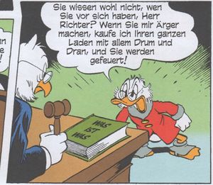 Abgesehen von Dagoberts Eigennutz ist eine weitere hervorstechende Eigenschaft der Geschichte seine Prahlsucht und die Gewissheit, sich alles mit seinem Geld kaufen zu können, sogar den Staat.