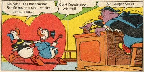 Um den ungeliebten Job loszuwerden, will Donald Dagobert auf andere Gedanken bringen und läuft mit einer Zeitung los, die von der Amnestie der Gaunerbande kündet.