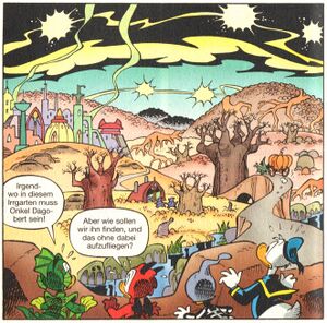 Es ist Halloween in Entenhausen und alle Kinder gehen auf die Jagd nach Süßen - natürlich auch Tick, Trick und Track. Doch nicht nur die Entenhausener sind unterwegs: Jedes Jahr an Halloween öffnet sich ein magisches Tor, über das Wesen aus einer anderen Welt, der Anderwelt, herüberkommen, um Süßes zu bekommen. Dieses Mal sind es drei kleine Monster und sie haben den schlechten Einfall, beim knickerigen Onkel Dagobert um Süßes zu betteln. Der gibt natürlich nichts und die Monster werden wütend. Sie verfolgen Dagobert, brechen in den Tresorraum ein – und verschleppen den reichsten Mann der Welt kurzerhand in ihre Welt. Die mutigen Jungs Tick, Trick und Track und Donald, die das ganze schreckensstarr beobachtet haben, folgen ihnen. Die Anderwelt ist eine Gruselwelt, in der es von Monstern nur so wimmelt. Zu allem Überfluss haben die Ducks auch noch wenig Zeit, denn um Mitternacht schließt sich das Portal zur Erde wieder. Also machen sie sich auf die Suche. Doch Dagobert wurde bereits abgeführt und soll nun seine Strafe bekommen, denn in Anderwelt ist das Halloweenfest heilig. Die Strafe besteht im Benetzen mit Anderweltstaub. Wer damit in Berührung kommt, erkennt die Regeln auf Ewigkeit an. In letzter Sekunde können Donald sowie Tick, Trick und Track den Prozess stoppen und mit Onkel Dagobert die Flucht ergreifen. Es folgt eine halsbrecherische Verfolgungsjagd in Richtung Portal. Die Ducks kommen gerade noch rechtzeitig an – hinter ihnen schließt sich die Pforte und sie sind gerettet. Nur Onkel Dagobert hat ein wenig von dem Anderweltstaub abbekommen, was sich durchaus gewinnbringend für die Halloween-Freunde herausstellt.