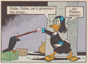 In „Die Irrfahrten des Dagobert Duck“ / „Oddball Odyssey“ ist er nach wie vor stumm, begleitet aber die Hexe zum ersten Mal außerhalb ihres Hexenhauses und imitiert sie in ihrer Gestik. Am Ende spricht Gundel ihren Raben sogar an und verhext ihn: „Raven, become a rat!“ Dies kann als eine Vorausschau auf Nimmermehrs späteren englischen Namen Ratface angesehen werden.
