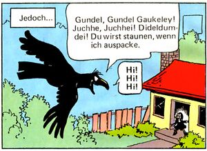 Schon bei Gundels Debüt in Barks' „Der Midas-Effekt" / „The Midas Touch“ sieht man in ihrer Behausung, neben allerlei anderem dem Hexen-Klischee entsprechenden Getier (Fledermäuse, schwarze Katze), einen grimmig dreinblickenden Raben auf einer Stange sitzen. Dieser redet allerdings nicht, interagiert nicht mit Gundel und wird auch nicht beim Namen genannt.