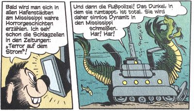Der landet tatsächlich unten in einem U-Boot, wo sich ein völlig verrückter Fahrer befindet: Ihm mache es Spaß, den Leuten Angst zu machen und so treibe er mit seiner Schlange sein Unwesen auf dem Fluss, um diesen zu einem gefürchteten Ort zu machen. Wenn sich dann niemand mehr auf den Mississippi traue, wolle er herauskommen und sich an den Schauergeschichten erfreuen. Donald hingegen will er in dem U-Boot lassen bis zu seinem Tode, da er ja nun sein Geheimnis kennt! Währenddessen begeben sich Tick, Trick und Track, nun auf sich allein gestellt, weiter auf die Suche. Mittlerweile hat sich wegen etlicher weiterer Anschläge der Seeschlange auch der Staat eingeschaltet, doch die Polizei kann nichts ausrichten. Die Drillinge hingegen sind schlau und dank eines Köders haben sie die Schlange mitsamt U-Boot am Golf von Mexiko bald am Haken!
