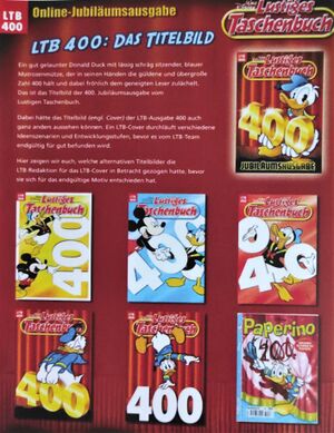 Anlässlich des Jubiläums der 400. Ausgabe des Lustigen Taschenbuches veröffentlichte der Egmont Ehapa Verlag am 9. März 2010n erstmalig eine Online-Ausgabe des Lustigen Taschenbuches auf der offiziellen Homepage des LTBs. Das als „E-Mag“ beworbene Magazin enthielt neben der deutschen Erstveröffentlichung der Comicgeschichte Sesselsucht (I TL 2680-6) ein redaktionelles Vorwort der LTB-Redaktion zum besonderen Anlass des Jubiläums, einen kurzen Abriss über die Geschichte des LTBs, eine Übersicht über Adaptionen von „historischen Ereignisse, Bestseller-Romanen und Kinofilmklassikern“ auf zwanzig ausgewählten Covern des LTBs sowie Hintergründe und Entwürfe zum Titelbild von LTB 400. Des Weiteren wurden historische Fakten zum Jahr 1967, dem Geburtsjahr des LTBs, zusammengetragen und berühmte Aussprüche aus von Dr. Erika Fuchs übersetzten Geschichten kompiliert. Abschließend wurden neun Aussagen als „Verrücktes LTB-Wissen“ zusammengefasst. Die Online-Ausgabe war als E-PopUp-Fenster verfügbar und konnte nach Belieben vergrößert werden. Zudem wurde das LTB 400 und die LTB Sonderedition – 400 Lustige Taschenbücher beworben. Auf der Homepage des LTBs wurden kurze Videoclips mit Geburtstagswünschen von Prominenten veröffentlicht, darunter Sebastian Krumbiegel, den Sportfreunden Stiller und Tocotronic.