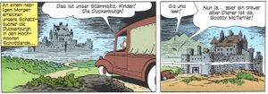 Zudem lässt Reiche Donald den Drillingen den Stammbaum stolz präsentieren, Tick lässt sich zu dem Wortspiel „Das ist ja eine unentliche Geschichte!“ hinreißen. Links steht Donalds 313 mit aufgeklappten Schwiegermuttersitz, die Abbildung ist wie üblich bei Disney-Comics der Zeit mit einer eher flachen Kolorierung ohne viele Schattierungen eingefärbt.
