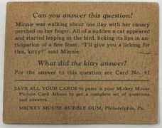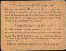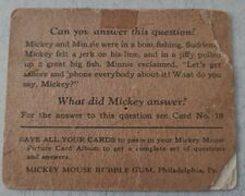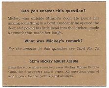 Die Kaugummireihe '''Mickey Mouse Bubble Gum''' erschien 1935 bei [[Gum Inc., Philadelphia]]. Zu den Kaugummis gab es Sammelkarten, die laut Kaugummikarten-Sammler Adam Cohen „wahrscheinlich der Ursprung der massenproduzierten Comic-Kartensätze sind“. <ref>Kevin Glew (20.06.2014). „PSA Set Registry: The 1935 Gum, Inc. Mickey Mouse Trading Card Set, Chasing Vintage Cards of the World's Most Famous Mouse“. [https://www.psacard.com/articles/articleview/8226/psa-set-registry-1935-gum-inc-mickey-mouse-trading-card-chasing-vintage-cards-worlds-most-famous psacard.com]</ref> <ref name=" | Die Kaugummireihe '''Mickey Mouse Bubble Gum''' erschien 1935 bei [[Gum Inc., Philadelphia]]. Zu den Kaugummis gab es Sammelkarten, die laut Kaugummikarten-Sammler Adam Cohen „wahrscheinlich der Ursprung der massenproduzierten Comic-Kartensätze sind“.<ref>Kevin Glew (20.06.2014). „PSA Set Registry: The 1935 Gum, Inc. Mickey Mouse Trading Card Set, Chasing Vintage Cards of the World's Most Famous Mouse“. [https://www.psacard.com/articles/articleview/8226/psa-set-registry-1935-gum-inc-mickey-mouse-trading-card-chasing-vintage-cards-worlds-most-famous psacard.com]</ref> Die Bildrechte an Micky holte sich Gum Inc. schon 1933.<ref name="smith" /> | ||