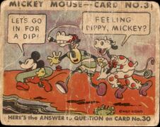 | 031 || Feeling Dippy, Mickey? Let's Go in for a Dip! || [[Bild:Mmbg-031A.jpg| | | 031 || Feeling Dippy, Mickey? Let's Go in for a Dip! || [[Bild:Mmbg-031A.jpg|x180px]] || [[Bild:Mmbg-031B.jpg|x180px]] || Clarabelle Cow, Horace Horsecollar and Mickey all went to the seashore for an outing. They played games and romped on the beach. Finally just before lunch, Mickey said, “Come on, everybody, let’s go in for a dip!” Then Clarabelle asked him a question. <br />What did she ask? <br />"Feeling dippy, Mickey?" || „dip“ = „tauchen“<br />„dippy“ / „verdreht“ | ||