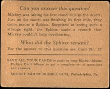 | 027 || That Camel Walks a mile for Mickey! || [[Bild:Mmbg-027A.jpg| | | 027 || That Camel Walks a mile for Mickey! || [[Bild:Mmbg-027A.jpg|x180px]] || [[Bild:Mmbg-027B.jpg|x180px]] || Mickey was taking his first camel ride in the desert. Just as the camel was finishing its first mile; they came across a Sphinx. Surprised at seeing such a strange sight, the Sphinx made a remark that Mickey couldn’t help overhearing. <br />What did the sphinx remark? <br />"That camel walks a mile for Mickey!" || <!-- Anmerkungen --> | ||