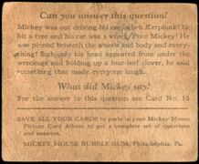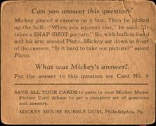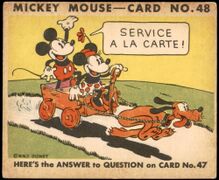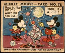 Anders als andere Kaugummikarten der Zeit zeigen diese statt historischen Fakten oder einer durchgehenden Handlung kleinere illustrierte Wortwitze. Die Textseite baut den Gag auf und verweist für die Punchline auf die farbige Illustrationsseite der Karte. Die Zeichnungen auf den Karten stammten laut einem 1995-Nachdruck des Albums von Walt Disney und die Gags von Hal Horne, auf den Karten wurde nur das Copyright von Disney vermerkt, Gum Inc. wird nur indirekt auf der Kartenrückseite als ''MICKEY MOUSE BUBBLE GUM, Philadelphia, Pa.'' genannt. | Anders als andere Kaugummikarten der Zeit zeigen diese statt historischen Fakten oder einer durchgehenden Handlung kleinere illustrierte Wortwitze. Die Textseite baut den Gag auf und verweist für die Punchline auf die farbige Illustrationsseite der Karte. | ||