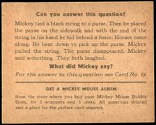 | 086 | Getting Purse-nal Horace? | Mickey tied a-black string to a purse. Then he placed the purse on the sidewalk and with the end of the string in his hand he hid behind a fence. Horace came along. He bent down to pick up the purse. Mickey pulled the string. The purse disappeared. Mickey said something. They both laughed. What did Mickey say? "Getting purse-nal, Horace?" |