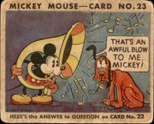 | 023 || That's an Awful Blow to Me, Mickey! || [[Bild:Mmbg-023A.jpg| | | 023 || That's an Awful Blow to Me, Mickey! || [[Bild:Mmbg-023A.jpg|x180px]] || [[Bild:Mmbg-023B.jpg|x180px]] || Mickey was trying to play a horn. Every time he blew it, the notes would come out sour and Pluto would make the funniest faces. Finally Mickey blew one note that was just awful, and Pluto made a remark that made Mickey laugh so much he couldn't play any more. <br />What did Pluto remark? <br />"That's an awful blow to me, Mickey!" || <!-- Anmerkungen --> | ||