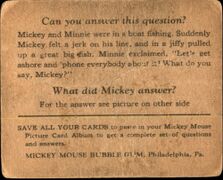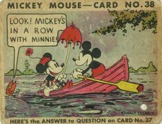 | 038 || Look! Mickey's in a Row with Minnie! || [[Bild:Mmbg-038A.jpg| | | 038 || Look! Mickey's in a Row with Minnie! || [[Bild:Mmbg-038A.jpg|x180px]] || [[Bild:Mmbg-038B.jpg|x180px]] || Mickey was taking Minnie for a ride in a row boat. He sat in the front end of the boat pulling at the oars with all his might. All of a sudden a little fish popped his head out of the water, and seeing Mickey rowing away said something very funny. <br />What did the little fish say? <br />"Look, Mickey's in a row with Minnie!" || <!-- Anmerkungen --> | ||