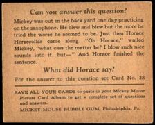 | 028 || I Blow Such Nice Sounds Into It! But Such Awful Sounds Come Out. || [[Bild:Mmbg-028A.jpg| | | 028 || I Blow Such Nice Sounds Into It! But Such Awful Sounds Come Out. || [[Bild:Mmbg-028A.jpg|x180px]] || [[Bild:Mmbg-028B.jpg|x180px]] || Mickey was out in the backyard one day practicing on the saxophone. He blew and blew but the more he tried the worse he seemed to be. Just then Horace Horsecollar came along. “Oh Horace,” wailed Mickey, “What can the matter be? I blow such nice sounds into it, but—” And Horace finished the sentence. <br />What did Horace say? <br />"But such awful sounds come out" || <!-- Anmerkungen --> | ||