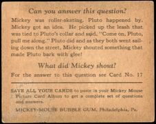 | 017 || Look! Free Wheeling! || [[Bild:Mmbg-017A.jpg| | | 017 || Look! Free Wheeling! || [[Bild:Mmbg-017A.jpg|x180px]] || [[Bild:Mmbg-017B.jpg|x180px]] || Mickey was roller-skating. Pluto happened by. Mickey got an idea. He picked up the leash that was tied to Pluto's collar and said, "Come on, Pluto, pull me along." Pluto did and as they both went sailing down the street, Mickey souted something that made Pluto bark with glee! <br />What did Mickey shout? <br />"Look! Free wheeling!" || <!-- Anmerkungen --> | ||