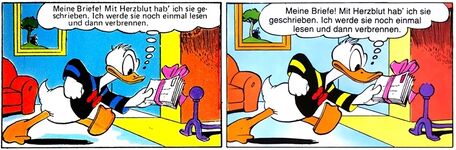 Sie beleuchtet ebenso, wie wertvoll beide für Daisy sind, sie ist in beide verliebt und hebt von beiden die Briefe auf. Über Gustavs Briefe lässt sich an der Hand der Geschichte berichten, das diese sehr schmalzig sind. Allerdings lässt sich im Rückschluss auch darauf schließen das die Briefe von Donald ebenfalls sehr peinlich sein müssen, da weder Donald noch Daisy bemerken, dass dies nicht die Briefe von ihm sind. | Sie beleuchtet ebenso, wie wertvoll beide für Daisy sind, sie ist in beide verliebt und hebt von beiden die Briefe auf. Über Gustavs Briefe lässt sich an der Hand der Geschichte berichten, das diese sehr schmalzig sind. Allerdings lässt sich im Rückschluss auch darauf schließen das die Briefe von Donald ebenfalls sehr peinlich sein müssen, da weder Donald noch Daisy bemerken, dass dies nicht die Briefe von ihm sind. | ||