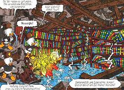 Also befindet sich die Bibliothek unter dem Geldspeicher! Spurobold hat schon eine neue Spur gefunden, die vier hinterher. Donald will immer noch nicht mitkommen, da Fernsehen ihm wichtiger ist. Nach einigen Hindernissen kommen Dagobert und die drei Neffen zum Notausgang des Geldspeichers, der früher Notausgang des Forts war und den Dagobert nie erforscht hat. Dort stoßen sie auf einen zugeschütteten Stollen, über den sie in einen geheimen Raum gelangen — in dem die Bibliothek ist! Und sie scheint in sehr