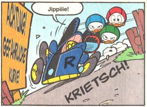 In Entenhausen steht ein großes Seifenkistenrennen an, über das überall in den Medien berichtet wird. Selbstverständlich lässt es sich Donald nicht nehmen, vor der Fernsehkamera mit seiner selbstgebauten Seifenkiste zu prahlen, um seinen ewig streitbaren Nachbarn Schurigel zu provozieren. Dieser will nämlich selbst an dem Rennen teilnehmen und es sowohl Donald als auch den Drillingen Tick, Trick und Track heimzahlen. Diese befürchten bereits das Schlimmste und konzentrieren sich lieber darauf, zusammen mit ihren Freunden eine gut ausgestattete Seifenkiste zu bauen. Die Rennstrecke führt nämlich an einer gefährlichen Haarnadelkurve vorbei, die um eine steile Klippe herumführt, an deren Abgrund schlammiger Morast wartet. Demzufolge sind die Jungs damit beschäftigt, die Lenkung zu verbessern und die Strecke zuvor zu besichtigen. Bei dem Ausflug begegnen sie einem dunkelhaarigen Jungen namens Rupert, von dem sie schon einiges gehört haben. Ihr Onkel Donald hat sie nämlich vor dem rüpelhaften Rupert Schurigel gewarnt, welcher der Neffe von Nachbar Schurigel ist und ein besonderes Talent fürs Seifenkistenfahren hat. | In Entenhausen steht ein großes Seifenkistenrennen an, über das überall in den Medien berichtet wird. Selbstverständlich lässt es sich Donald nicht nehmen, vor der Fernsehkamera mit seiner selbstgebauten Seifenkiste zu prahlen, um seinen ewig streitbaren Nachbarn Schurigel zu provozieren. Dieser will nämlich selbst an dem Rennen teilnehmen und es sowohl Donald als auch den Drillingen Tick, Trick und Track heimzahlen. Diese befürchten bereits das Schlimmste und konzentrieren sich lieber darauf, zusammen mit ihren Freunden eine gut ausgestattete Seifenkiste zu bauen. Die Rennstrecke führt nämlich an einer gefährlichen Haarnadelkurve vorbei, die um eine steile Klippe herumführt, an deren Abgrund schlammiger Morast wartet. Demzufolge sind die Jungs damit beschäftigt, die Lenkung zu verbessern und die Strecke zuvor zu besichtigen. Bei dem Ausflug begegnen sie einem dunkelhaarigen Jungen namens Rupert, von dem sie schon einiges gehört haben. Ihr Onkel Donald hat sie nämlich vor dem rüpelhaften Rupert Schurigel gewarnt, welcher der Neffe von Nachbar Schurigel ist und ein besonderes Talent fürs Seifenkistenfahren hat. | ||