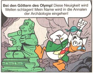 Primus sucht nun selbst den Archäologen auf, und die beiden gehen zusammen zum Geldspeicher, da Dagobert kein Besitzer der Statue ist und verpflichtet sei, sie der Archäologie zu übergeben, was dieser jedoch verweigert und die beiden mithilfe seines Alarmsystems aus dem Geldspeicher befördert. Dagobert beschließt, die Statue nach Griechenland zu schicken. Dort wird sie dann in einem Kleinlaster verstaut, den Donald, nichts von der Ladung wissend, zu einer Villa bringen soll.