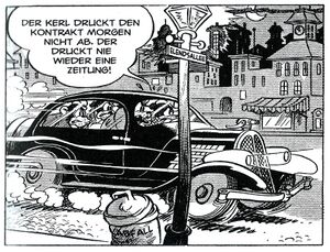 Es handelt sich um Karlo, der nun die Druckmaschine der Zeitung komplett zerstört hat. Aber Micky war wieder einmal schlauer und konnte noch eine Sonderausgabe vordrucken, in der nun die exklusiven Enthüllungen stehen: Karlos Bande ist Korruptionen mit dem Stadtrat eingegangen. Karlo hat die Müllabfuhr-GmbH gestellt und für einen viel zu hohen Preis den Zuschlag erhalten, auch wenn eine andere Firma viel weniger Geld wollte. Mit dem zuviel gezahlten Geld der Stadt hat er dann sich und die hohen Tiere im Rat ausgezahlt, die das ganze erst möglich gemacht hatten, denn sie konnten die anderen überstimmen und somit erst dafür sorgen, dass Karlos Unternehmen den Zuschlag erhielt. Dank phänomenaler Arbeit konnte die Stadt aufgerüttelt werden und ist jetzt von der Korruption befreit. Jedoch will Micky nicht weiter im Nachrichtengeschäft tätig sein und verkauft die „Kriegstrommel“ zurück an Herrn Fussel, der nun in Ruhe arbeiten kann.