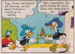 In der Übersetzung von Dr. Erika Fuchs wird Willibald zu Donalds Onkel. In dieser Geschichte besuchen Donald und seine Neffen Willibalds Farm, wo Donald zeigen möchte, dass er ein echter Cowboy ist. Als Kind hat Donald aufs Willibalds Ranch das Reiten gelernt. Nachdem Donald mit dem Pferd Satan gescheitert ist, gibt Willibald ihm ein zahmeres Pferd namens Bobby, mit dem Donald allerdings auch scheitert.
