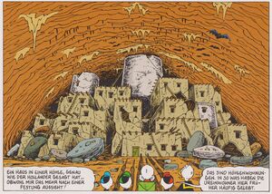 Da entdecken sie durch Zufall den Eingang zu einer Höhle in einer Felswand. In dieser Höhle befindet sich eine beeindruckende Felsenstadt, sowie eine Nachricht von Jacob Waltz, der erzählt, wie er die Mine gefunden hat: Peralta zeigte sie ihm, wurde jedoch von Apachen vertrieben und wollte nie mehr zurückkehren. Daher sei er, Waltz, der einzige, der weiß wo die Mine ist. Allerdings könne er aufgrund der Apachen das Gold nicht mitnehmen. Just in dem Augenblick schallt ein lautes „HEUREKA!“ durch die Höhle – Dagobert hat das Gold gefunden! Und es ist wirklich atemberaubend: Tonnen von reinem Gold!