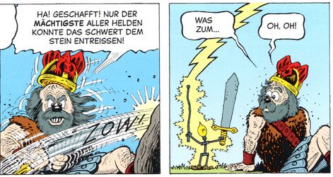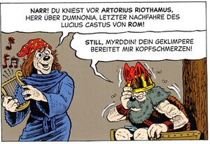 Don Rosa geht in seinem Comic auf einen „wahren“ König Artus (Artorius Riothamus) und einen „wahren“ Merlin (Myrddin), der hier noch die Rolle eines keltischen Barden hat, ein. Tick, Trick und Track finden sie sowie ihr befestigtes Dorf Camallate (Camelot) sogar in ihrem Schlauen Buch. Allerdings widersprechen die allermeisten akademischen Historiker der Vorstellung, dass es einen „wahren“ König Artus gegeben haben könnte. Seine Historizität leistet sich nur aus Quellen ab, die mehrere hundert Jahre nach seinem möglichen Ableben verfasst wurden und ihrerseits diverse Implausibilitäten enthalten, bzw., wenn man sie dekonstruiert, in ihren gegebenen Fakten nicht mehr glaubwürdig erscheinen (dies betrifft vor allem die sogenannte „Schlachtenliste“ von König Artus, die in der Historia Brittonum des Nennius enthalten ist).[8] Nennius wird als Quelle herangezogen, um die von den Britanniern gewonnene Schlacht am Mount Badon (vermutlich nahe Bath, aber auch dies ist keineswegs sicher) König Artus zuzuschreiben, wie es auch in Rosas Comic der Fall ist. Die erste Quelle, die die Schlacht erwähnt (Gildas), ordnet diese allerdings nicht Artus zu, den er gar nicht erwähnt. Teilweise wurde der von Gildas in der Passage genannte Ambrosius Aurelianus als Anführer der Britannier in der Schlacht gesehen, aber auch dagegen gibt es gewichtige Einwände.[9] Ambrosius Aurelianus ist jedenfalls einer der Kandidaten für die Suche nach dem Kern des „wahren“ König Artus – eine Suche allerdings, die etliche Historiker für völlig sinnlos erachten.
