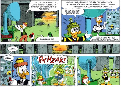 Daniel Düsentrieb hat einen Helm erfunden, mit dem man Zeitreisen machen kann, und Donald ist wild entschlossen, diesen zu vermarkten. Doch bislang funktionieren alle Tests, für die Donald als Versuchsperson zur Verfügung steht, nicht. Tick, Trick und Track wenden besorgt ein, dass das Reisen ohne Zeitmaschine ohnedies äußerst gefährlich ist. Wenn Donald in einer Zeit landet, in der sich anstatt Düsentriebs Werkstatt an der Stelle ein Baum befindet, würde Donald mittendrin landen – nicht unbedingt sehr gesund, denn er könnte sogar explodieren! Für die weiteren Experimente sollten sich Donald und Herr Düsentrieb lieber einen Platz suchen, der vor 5000 Jahren genauso aussah wie heute. Tick, Trick und Track schlagen den idealen Platz vor – Stonehenge!