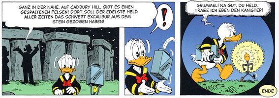 Zurück in der Gegenwart ist alles an seinem Platz, inklusive verärgertem Fremdenführer. Donald und Helferlein sollen Benzin organisieren. Donald wirft Helferlein den Benzinkanister zum Tragen zu. Doch da erklärt der Fremdenführer einer Touristin, dass der edelste Held aller Zeiten das Schwert Excalibur aus dem Felsen gezogen hat! Donald darf seinen Kanister selber tragen.