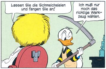 - „Friseure, Coiffeure, Barbiere, Bader – ein altehrwürdiges Gewerbe! Donald Duck übt es auf seine eigene, höchst moderne Art aus…“– Dr. Erika Fuchs, frei nach Carl Barks