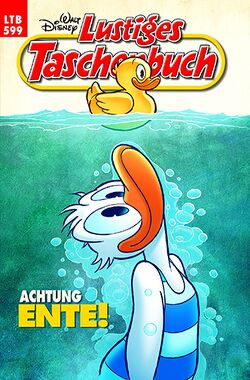 Das Cover ist eine Hommage an das Filmplakat des US-amerikanischen Kinofilm Der weiße Hai (Jaws) des Regisseurs Steven Spielberg. Der mit drei Oscars ausgezeichnete Blockbuster kam am 20. Juni 1975 in die Kinos und feiert damit im Sommer 2025 sein 50. Jubiläum. Auf dem LTB-Titelbild ersetzt Donald Duck im Badeanzug den aus der Tiefe aufsteigenden Killerhai, das beschauliche Badeentchen steht für den nichtsahnenden Schwimmer.