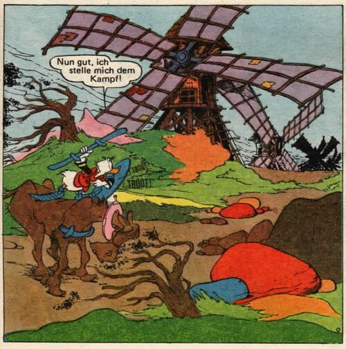 „Das Land hier ist meins, weil ich hier sterben werde! Merk dir: Einem fahrenden Ritter widerspricht man nicht!“ - „Dann stirb nicht, Ritter, sondern fahr!“ (Donald Quichotte und Onkel Dagobert)