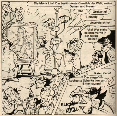 Es sind die aufregenden Tage, bevor die berühmte Mona Lisa von Leonardo da Vinci im Entenhausener Kunstmuseum ausgestellt werden soll: Micky wird aus einem unbefriedigenden Angelurlaub (Goofy angelt ohne Köder) von Kommissar Hunter wegen eines rätselhaften Bankraubes zurück nach Entenhausen beordert. Ein anonymer Anrufer verspricht, das Geld werde in den Tresorraum zurückgebracht. Und am folgenden Morgen stellen die noch beduselten Micky, Goofy, Hunter und Inspektor Issel tatsächlich fest: das Raubgut ist wieder da!... Auch die folgenden Ankündigungen des rätselhaften Anrufers bewahrheiten sich: Drei Bilder aus dem Kunstmuseum sowie die Rathausuhr werden geraubt, tauchen bald darauf dort aber wieder auf, als wäre nichts geschehen. Nun wendet sich das augenscheinliche Diebsgenie der Mona Lisa zu: Der Bürgermeister und Hunter sind verzweifelt, sehen ihre Karriere bereits vor dem Aus. Doch Micky recherchiert in der Zwischenzeit die Lösung des Falles und den von ihm vermuteten Täter: Kater Karlo! Er bewegt die Stadtoberen, als die Mona Lisa tatsächlich verschwindet, die Geldübergabe – der Dieb verlangt eine Million Taler – zu initiieren und Karlo dabei festzunehmen, unbesehen der Möglichkeit, dass durch einen Komplizen das weltberühmte Gemälde beschädigt werden könnte. Und er behält recht: Die Frau mit dem Lächeln ist am nächsten Morgen wieder da! Karlo hatte eine Kamera benutzt, die keine Fotos macht, sondern einem Gegenstand die Farben entzieht. Mit dem Tageslicht kommen diese wieder zum Vorschein. Auch die vorherigen Dinge waren also nie geraubt, sondern bloß unsichtbar! Nur Goofy hat seine eigene Lösung des Falles. Da er von Mickys Krimilektüren weiß, dass immer derjenige der Täter ist, der am wenigsten verdächtigt wird, triumphiert er: „Also kann in diesem Fall nur einer der Schuldige sein! Nämlich ich!“