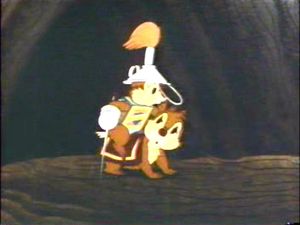 Dies ist die Gelegenheit für Donald. Er greift sich sich die beiden und steckt sie in das Maul des vermeintlichen Drachen. Mit einer Eisenstange können sich die beiden Streifenhörnchen befreien.