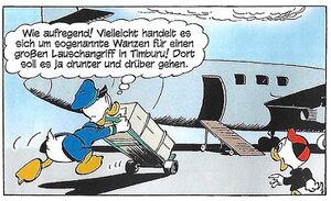 Derweil erfährt Donald von seinem Flugziel am Elchfluss, wo er die Kiste nur abliefern und im Gegenzug eine andere Kiste entgegennehmen soll. Darüber, dass er wieder nur von Geheimagenten träumen darf, ist Donald sichtlich nicht erfreut. Auch dass er ganze vier blinde Passagiere mitführt, wird Donald erst nach der Landung bewusst, als er aus dem Cockpit kommt.