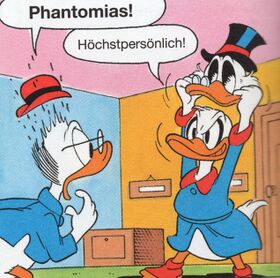 Des Weiteren ist es auch nicht das erste Mal, dass Phantomias in die Privatvilla von Onkel Dagobert einbricht. Diese Tat gelingt ihm zuvor schon in Die Verwandlung(1969, u. a. LTB 41) und Phantomias in Aktion (1970, u. a. LTB 41). Wieder bemüht er den Schleudersitz seines 313 bzw. X, um über die Mauer zu kommen. Um dieses Mal den Hunden zu entgehen (die man nicht sieht), balanciert er wie ein Akrobat mit einer Stange auf einem Seil.