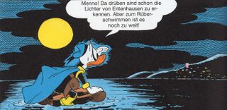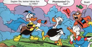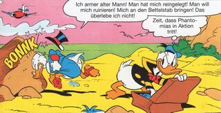 Phantomias war allerdings eingeschlafen und reagiert zu spät, dass das Flugzeug ins Meer stürzt. Erst durch den Aufprall auf das Meerwasser jäh geweckt. Zum Glück schafft es Phantomias, der wie durch ein Wunder unverletzt geblieben, aus dem Cockpit zu entkommen. Allerdings muss er schnell erkennen, dass er ohne fremde Hilfe nicht nach Entenhausen gelangen kann, da das Ufer viel zu weit entfernt ist. Dank seiner Hilfsmittel und seines Mutes gibt sich der Held aber nicht geschlagen und schafft es mit ein wenig Einfallsreichtum und einem tierischen Kompagnon, bei Einbruch der Dämmerung den Strand der Bucht von Entenhausen zu erreichen.