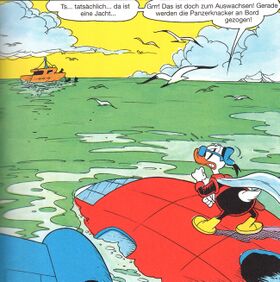 Phantomias belauscht das Gespräch der beiden Panzerknacker und realisiert, dass hinter der Aktion ein geheimer Drahtzieher steckt. Mitten auf dem Ozean verlassen die Panzerknacker auf Befehl des mysteriösen Anführers das Flugzeug, nachdem sie die geheimen Koordinaten erreicht haben, und springen mit Fallschirmen ab, um auf einem Schiff zu landen, das bereits auf sie wartet.