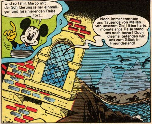 Kam Marco Polo gar nicht bis China?... 1978 hatte John W. Haeger in dem sinologischen Fachaufsatz „Marco Polo in China? Problems with internal evidence“ eine seitdem mehrfach, vor allem 1995 durch die Historikerin und Kuratorin der Chinesischen Sammlungen in der British Library, Frances Wood, erneuerte Debatte angestoßen. Woods war der Ansicht, Polo sei zwar in Asien gewesen, habe aber über China lediglich Erzählungen anderer Reisender, die er unterwegs traf, niedergeschrieben. Merkwürdig sei neben der Beobachtung, dass Polo die Große Mauer nicht erwähnte, auch die Tatsache, dass es aus chinesischen Quellen keinen Nachweis für seinen Aufenthalt im Reich der Mitte gebe. Auch wenn es mittlerweile gute Gegenargumente zu dieser skeptischen Position gibt – seine Informationen von den Windzyklen im Südchinesischen Meer habe Polo ebenso schwer irgendwo anders her bezogen haben wie seine präzisen Kenntnisse des chinesischen Steuer- und Papiergeldsystems – hat die Frage nach der Authentizität der Berichte Marco Polos das Zeug dazu, auch in Zukunft immer wieder aufzubrechen. Ob Romano Scarpa, als er sich 1982 dem Thema widmete, Haegers Thesen kannte, ist nicht bekannt, doch ihm als Venezianer scheint es so oder so darum zu tun gewesen sein, den für die kollektive venezianische Erinnerung so wichtigen Stadthelden in möglichst gutem Licht dastehen zu lassen. Ersterschienen war Scarpas mit Guido Martina als Co-Autor realisierte Disney-Adaption von Polos Reisebericht in vier Ausgaben des Topolino in der Adventszeit des Jahres 1982, was dem Werk fast den Anstrich jener Weihnachts-Vierteiler gibt, welche damals im Monat Dezember die europäischen Fernsehbildschirme zu beherrschen pflegten. Scarpa gibt sich durchaus als Kenner des „Il Milione“ – der Titel ist wahrscheinlich abgeleitet von dem venezianischen Stadtteil, in dem die Polos lebten – zu erkennen. Die inhaltlichen Bezüge zwischen Comic und Reisebericht sind mehr als nur oberflächlich; zum Beispiel übernahm Scarpa in der letzten Episode den Bericht Polos über seine Rückreise als Begleitung einer mongolischen Prinzessin, die als Gemahlin für den Khan des persischen Khanats ausersehen war. Zeichnerisch versteht es Scarpa, die exotischen Schauplätze, die Wüsten und Weiden, die von mystischen Nebelschwaden umwallten Berge und Täler, sowie die chinesischen Wunderdinge kunst- und wirkungsvoll in Szene zu setzen, ja es ist ein für Disney-Comics seltener geo- und ethnographischer Anspruch zu spüren, den Scarpa selbst an sich und sein Projekt anlegte. Ein Meisterstück ist auch die Erzählstruktur: In einem Entenhausener Fernsehstudio liest Autor Micky ein Drehbuch vor, in dem es darum geht, wie Marco-Polo-Donald nach seiner Rückkehr nach Venedig seine Abenteuer erzählt. Die eigentlichen China-Geschehnisse sind dann also schon die dritte Erzählebene. Erzählerisch und zeichnerisch verschmelzen auf diese Weise Entenhausen, Venedig und das ferne China immer wieder zu einem utopischen Sehnsuchtsort für junge Leser. Wer in erster Linie mit den Scarpa-Geschichten der Sechziger Jahre aufgewachsen ist, für den bleibt in diesem Spätwerk jedoch ein kleiner Wermutstropfen: Die Storylines, die Binnenhandlungen der einzelnen Episoden sind einigermaßen vorhersehbar und fast schon einen Tic zu routiniert in Gang und zu Ende gebracht – es fehlt ein wenig die frische Innovationskraft mit der Prise Verrücktheit aus den Plots des frühen Scarpa. Und vielleicht ist der Stolz auf die „Serenissima“ bei Scarpa dann gelegentlich doch zu dick aufgetragen. (14/15) Hobrowili (Diskussion) 11:49, 17. Okt. 2025 (CEST)