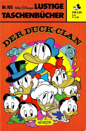 Seit 1983 wurde die US-amerikanische Fernsehserie „Dynasty“ rund um Familienintrigen unter den Reichen und Schönen der Rocky Mountains auf europäischen Fernsehkanälen ausgestrahlt, so auch im italienischen Staatssender RAI. Die Macher der I Classici-Bände fanden es nur ein Jahr später offenbar eine gute Idee, die Entenhausener Welt daran zu messen, und benannten einen ihrer Bände „Paperino Dynasty“. Als ein Jahr später das deutsche Pendant erschien, übernahm Ehapa die Idee und übersetzte für den deutschen Markt wörtlich: „Der Duck-Clan“, denn in Deutschland hieß diese Serie „Der Denver-Clan“. Das Cover stammt unverkennbar von Marco Rota, der vor allem Donald mit klarem, überlegenem Blick darstellt, aber auch als jemanden, der nicht weiß, welche Gefahr ihm droht (vor allem von seinem bereits hinterhältig dreinblickenden Onkel Dagobert). Klassisch und schön – mit deutlicher Ausnahme des rostbraunen Hintergrunds. (11/15) Hobrowili (Diskussion) 21:01, 12. Okt. 2025 (CEST)