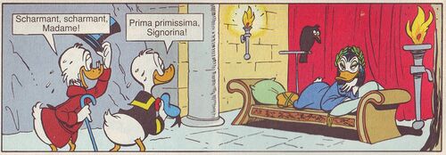Im Gegensatz zum englischen Original baute Erika Fuchs auch noch einen weiteren Witz in die Zaubersprüche ein. Bei der Verwandlung Dagoberts in einen Esel erwähnt er zuvor, dass er als Taube wegfliegen könne. Dies gibt Gundel zu denken und sie verwandelt ihn in einen Esel.