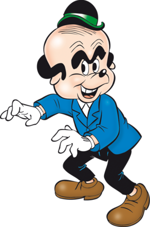 Er hat buschige Augenbrauen, plumpe Latschen, einen schwarzen Haarkranz und einen schwarze Melone.