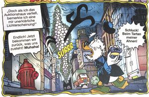 In einer düsteren Gewitternaht klopft es an der Tür des Geldspeichers. Draußen steht – Mac Moneysac! Er bittet panisch um Einlass und erzählt eine schaurige Geschichte: Bei einer Aktion in Entenhausen habe er ein seltsames Gerät ersteigert, das nicht von dieser Welt zu sein scheint und von unglaublichem Wert sei. Auf dem Rückweg sei er dann aber plötzlich von gigantischen Schattenwesen angefallen worden, die das Gerät entwenden wollten! Daher sei er zum Geldspeicher geflohen. Dagobert glaubt seinem hinterhältigen Dauerrivalen natürlich erstmal nicht, doch plötzlich stehen die Schattenwesen im Geldspeicher und entführen Tick, Trick und Track, sowie das seltsame Gerät, durch ein Portal…
