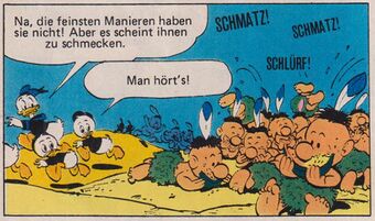 Donald hat Angst um die Neffen und denkt, dass sie Kannibalen sind. So schießt er mit einem Revolver, um die Indianer zu verjagen. Das gelingt zwar, aber auch die Vögel fliegen zum anderen Planeten. Als Donald dann noch Eier der Vögel als Proviant einsammeln will, verärgert er die Indianer, die ihn gefangen nehmen. Auch die Neffen werden gefangen und die Indianer reden unverständliche Wörter. Doch das Schlaue Buch hat die passende Übersetzung parat und so erkennen die Ducks, dass die Eier die Nahrungsquelle der Indianer sind. Dagobert, der sich in der Rakete verschanzt hat, gibt den Indianer die in den Vorratsräumen befindlichen Nahrungsmittel.