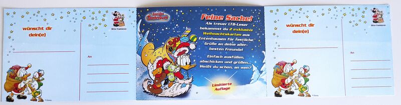 Abonnenten des Lustigen Taschenbuches erhielten als weihnachtliche Beilage zwei Postkarten mit besinnlichen Motiven zum Versenden an Freunde. Die zweite Postkarte wird vom Cover des LTB Weihnachten 8 geziert.