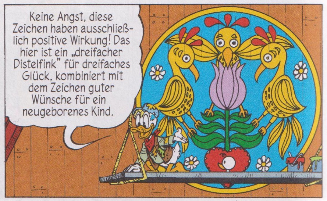 Das Zeichen des dreifachen Distelfinks, von dem Daphne Duck laut Gustav, der Pechvogel (Don Rosa) ihr Glück hat, das sie an ihren Sohn Gustav weitervererbt hat.