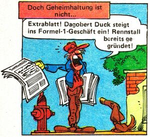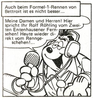 |   | ZeitschriftenDie Zeitung ist wohl das wichtigste Entenhausener Medium. Neben dem immer wieder gern verwendeten Entenhausener Kurier gibt es auch noch den „Anzeiger“ und andere Presseagenturen, meist in der Hand von Dagobert Duck oder Klaas Klever. Gelegentlich spielen auch ausländische bzw. außerstädtische Publikationen oder Schülerzeitungen eine Rolle. Fachzeitschriften werden auch immer wieder verwendet, so kommt etwa in Die Nervensäge (LTB 354) das Blatt Trautes Heim vor. Jedem Typ werden dabei eigene Themen zugeordnet (Zorngiebel liest Der kleine Gärtner, Ede Wolf Braten-Bote). So können Personen auf ihren Beruf / ihre Hobbys hin schnell identifiziert werden. Selbst Dagobert, der sich eigentlich immer die Zeitungen vom Vortag im Stadtpark zusammensucht, bekommt in Im Reich der Sterne (LTB 132) ein „Milliardärs-Blatt“ in die Hand gedrückt. Über die Zeitung erfahren Entenhausens Bürger entweder das Neueste über die Fälle von Phantomias oder Micky Maus, oder es wird gemeldet, dass die Panzerknacker auf freiem Fuß sind. Immer wieder werden auch die Neuesten Entwicklungen aus den Häusern Duck und Klever bekanntgegeben. FernsehenAuch sehr gefragt ist das Fernsehen, über das Micky und Goofy Informationen für ihren neuesten Einsatz oder Onkel Dagobert und Neffen für ihre neueste Expedition bekommen. So spielen Fernsehnachrichten z. B. in der LTB-Storyserie Bigfoot eine wichtige Rolle. Meist läuft es so ab: Onkel Dagobert lädt sich selbst zum Essen bei Donald und den Kindern ein. Diese schalten nebenbei das Fernsehen ein, in dem dann die entscheidende Nachricht gesendet wird - sei es eine aktuelle Schlagzeile, eine wissenschaftliche Diskussionssendung, ein Dokumentationsfilm oder die neueste Entenhausener Unterhaltungsshow - die zu einer Expedition, einer Geschäftsidee oder einer Kontaktaufnahme mit Daniel Düsentrieb führt. Der häufigste Sender in deutschen Geschichten ist ETV (Entenhausen TV), ab und zu trifft man auch auf ZEF (Zweites Entenhausener Fernsehen) oder andere Sender wie DTV. Donald, Gustav und teilweise auch Daisy schauen auch immer wieder gern Schnulzen und andere endlose Fernsehserien. |    |
