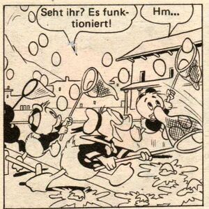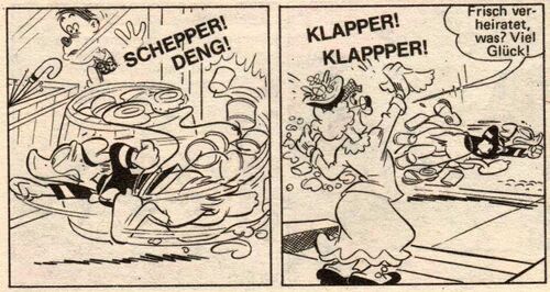 Von Beginn der Sechziger Jahre an arbeitete Romano Scarpa besonders gerne mit den beiden Brüdern Abramo und Giampaolo Barosso zusammen, die ihm gag- und temporeiche, klassisch komponierte, aber nicht allzu komplizierte Skripts lieferten, die Scarpa dann mit dem ihm eigenen zeichnerischen Leben füllte. Das Kreuz und Quer und Hin und Her der rasanten Handlung zwischen Glück und Pech schreit geradezu nach den Talenten des besten italienischen Zeichners seiner Generation: unvorhergesehene Wendungen, die sich auf den Gesichtern der Protagonisten abzeichnen, die gesamte Emotionspalette zwischen tiefster Verzweiflung und euphorischster Freude, der Einsatz von Händen, Füßen, ganzen Entenkörpern in pfeilschneller Bewegung, was kein Panel wie das andere wirken lassen. Ein Glück für diesen Band, dass es (wenigstens) diese Geschichte gibt! (13/15) Hobrowili (Diskussion) 21:01, 12. Okt. 2025 (CEST)